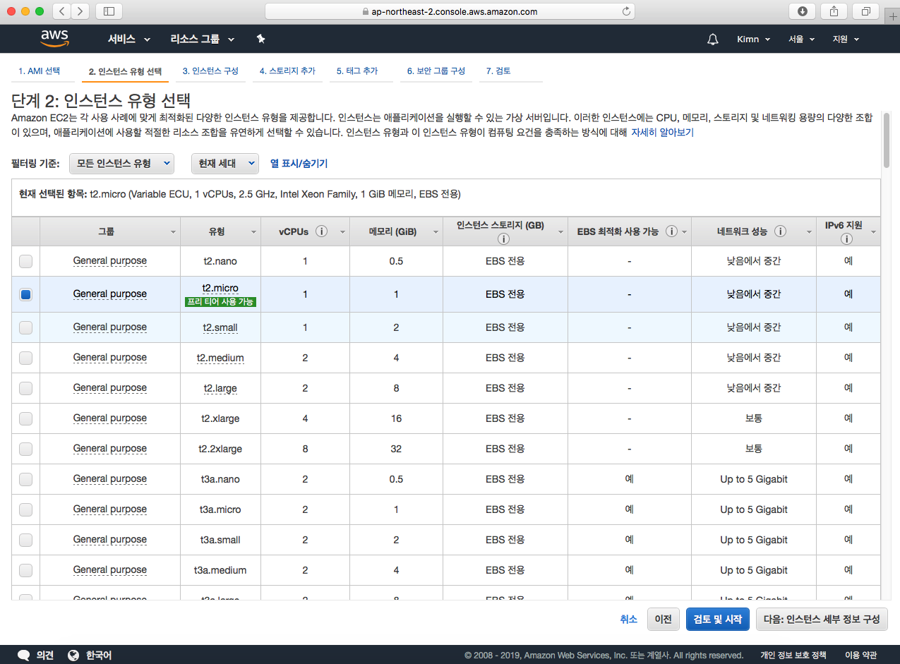 인스턴스 유형에 들어가시면 많은 컴퓨팅 요건들이 있습니다. 저는 프리 티어이기에 유형에 프리 티어 사용 가능으로 표시되어 있는 요건을 선택하였습니다. 나머지 설정은 이후에 하기 위해 검토 및 시작을 클릭하였습니다.