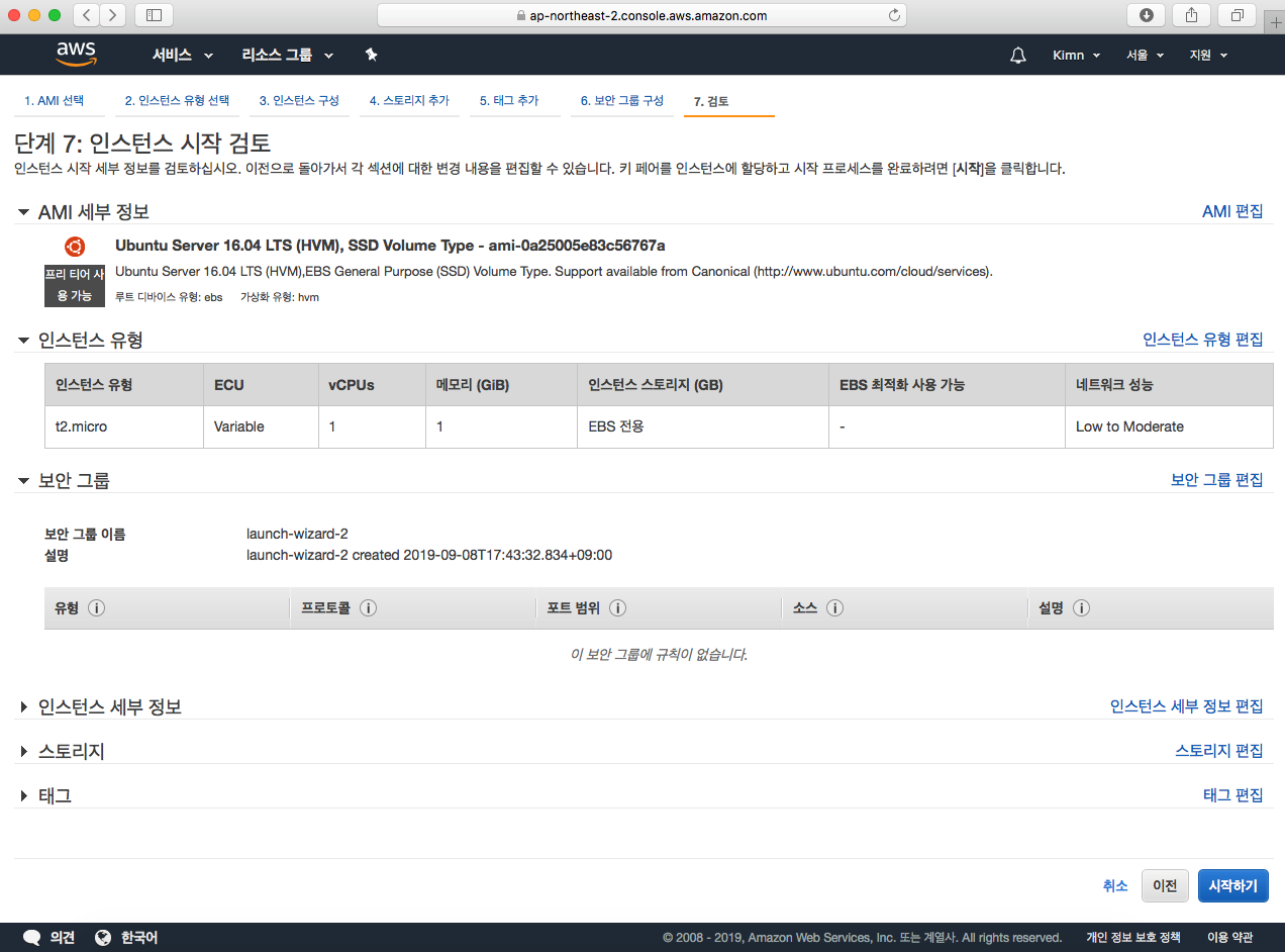 검토 및 시작을 클릭하신 후 시작하기를 눌러 진행시킵니다.