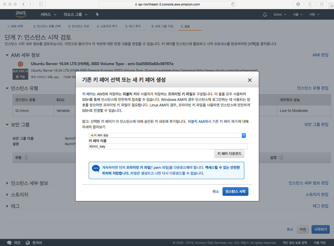 키 페어 이름을 정하신 후 해당 키 페어를 개인 저장소에 저장합니다.
