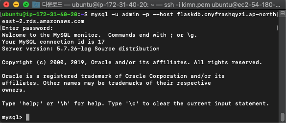 mysql -u [Master username] -p --host [엔드포인트 주소]
