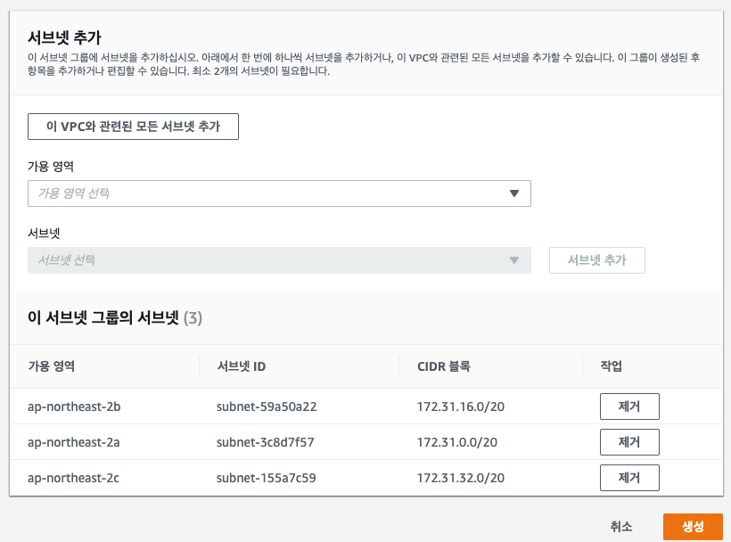 [생성]을 눌러 서브넷 그룹을 생성합니다.