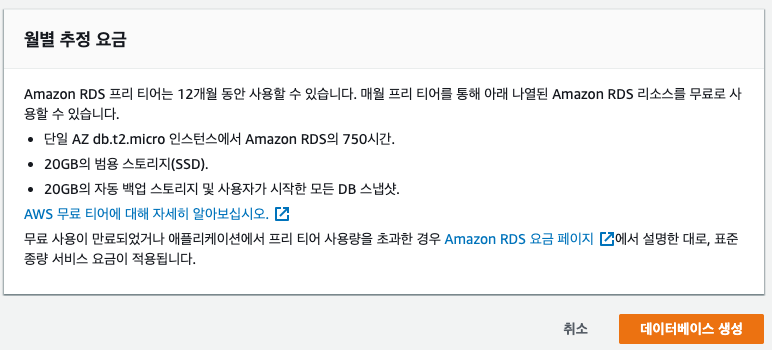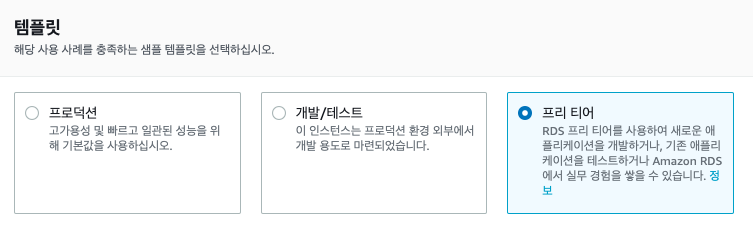 무료로 사용하기 위해 프리 티어를 클릭합니다. 이외에 다른 템플릿을 클릭 시, 비용이 추가됩니다.