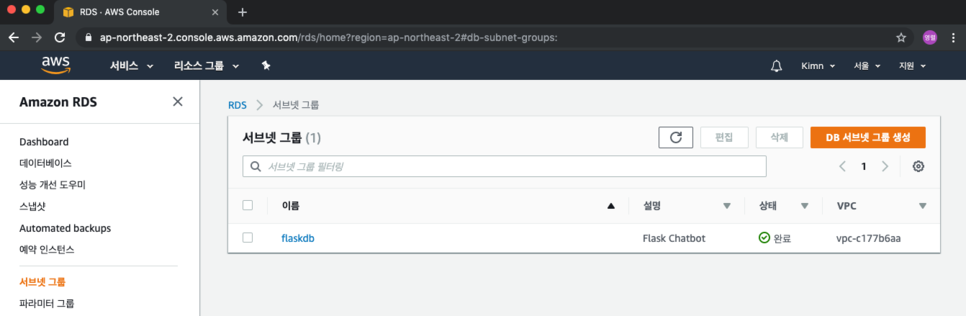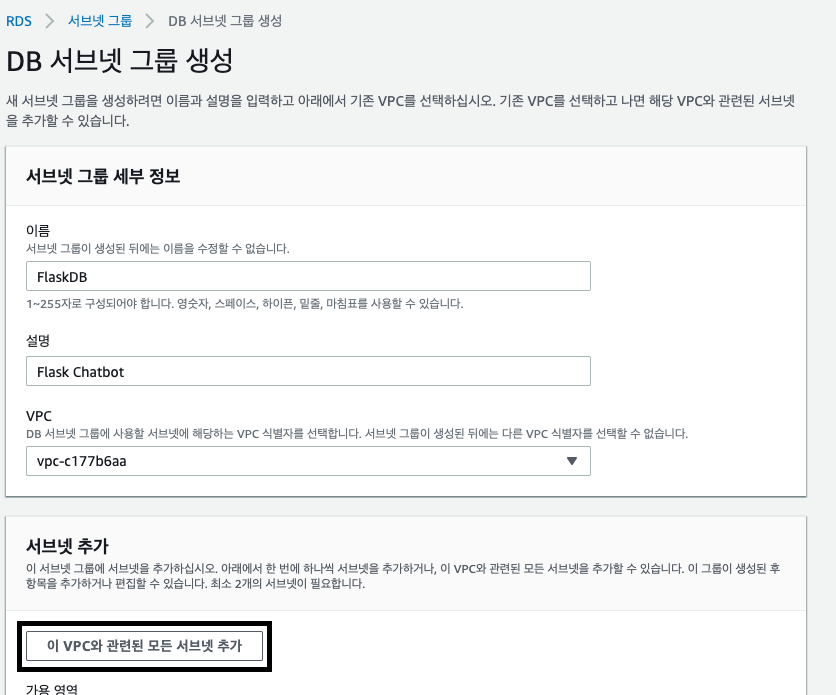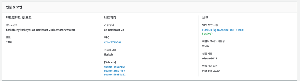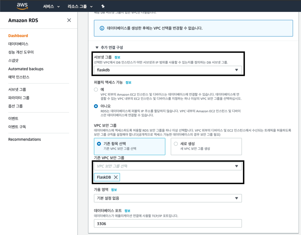 서브넷 그룹은 방금 생성한 그룹을 선택하고 VPC 보안 그룹도 만들었던 FlaskDB를 선택합니다.