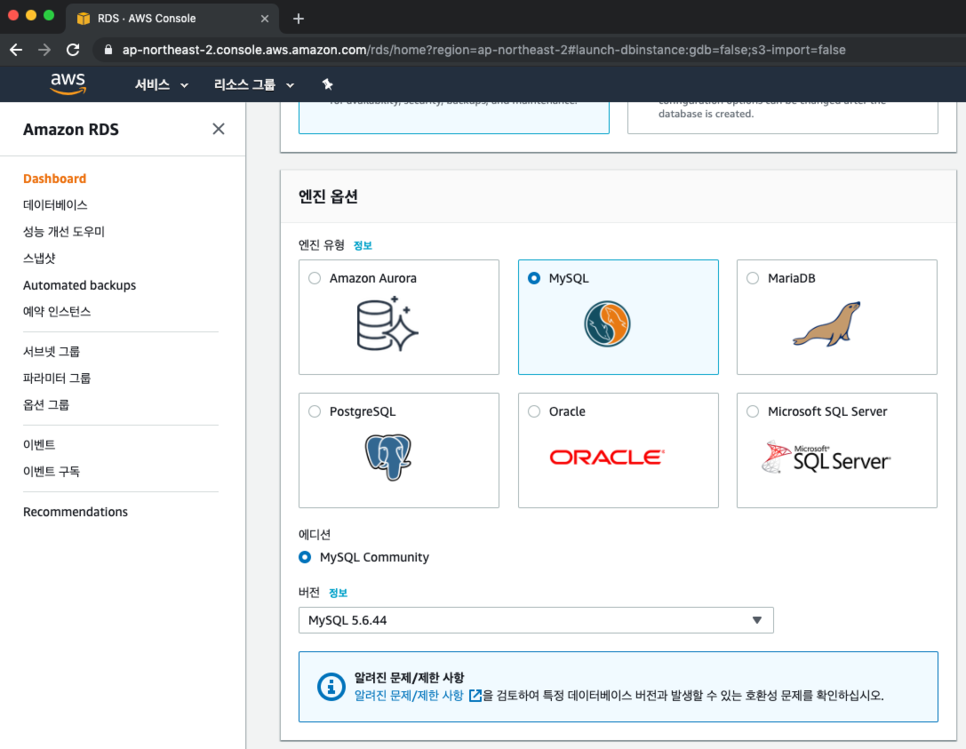 엔진을 MySQL을 클릭하여 생성합니다. (위의 이미지는 5.6이지만 다시 삭제하고 5.7로 만들었습니다.)
