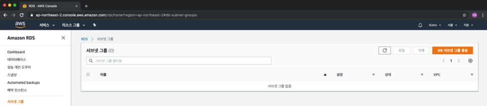 AWS RDS를 설정할 차례입니다. 먼저 좌측에 [서브넷 그룹] 탭을 이동하여 [DB 서브넷 그룹 생성] 을 통해 그룹을 생성합니다.
