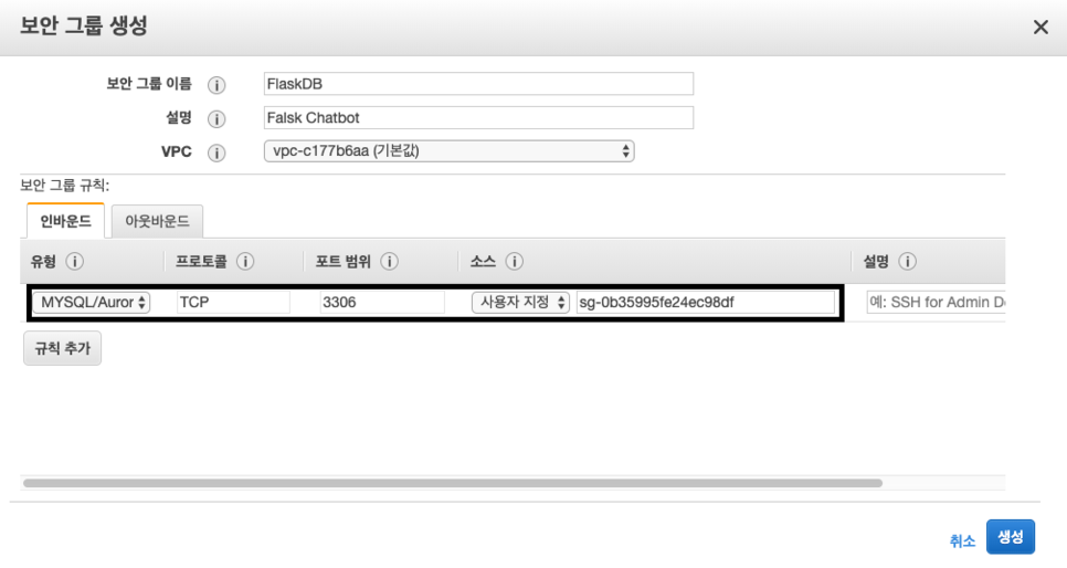 보안 그룹 이름과 설명을 입력한 후, 인바운드 유형을 MySQL을 선택하면 자동적으로 포트가 3306으로 잡히게 됩니다.