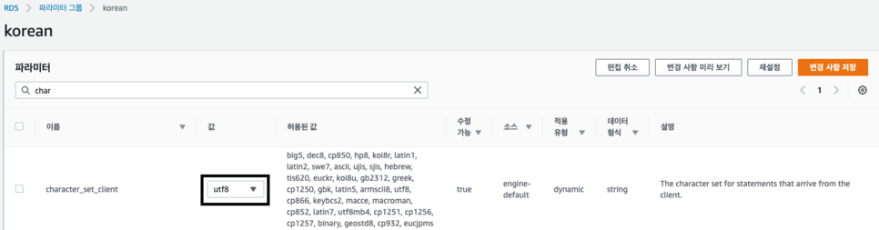 [파라미터 그룹 패밀리]에는 Mysql 5.7 버전으로 선택하였고 [그룹 이름]은 'korean' 로 설정하였습니다.
