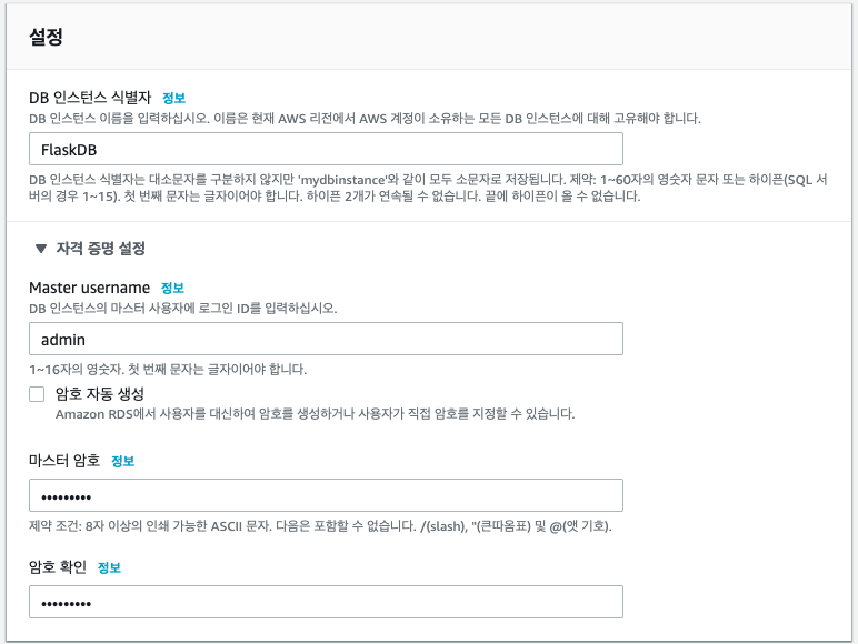 식별자와 Master username, 암호를 입력해줍니다.