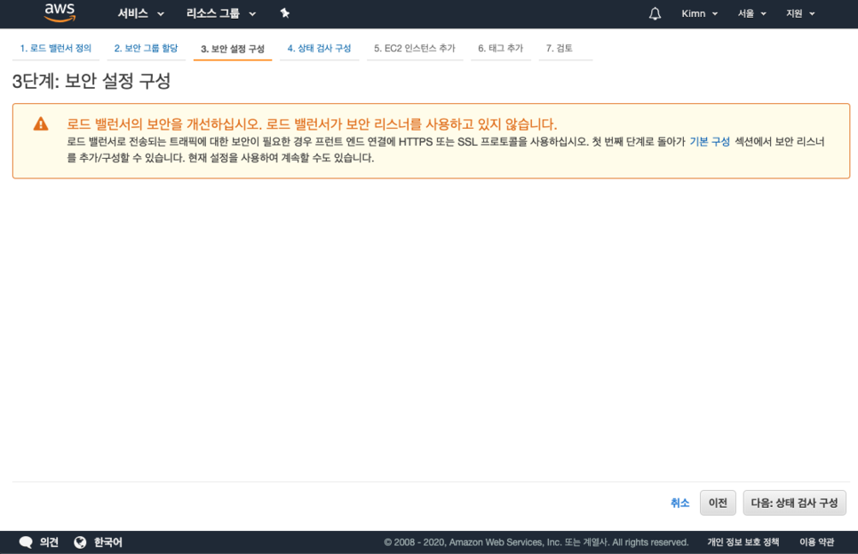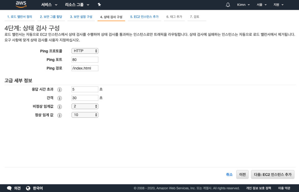 6. 로드 밸런서는 EC2 인스턴스에 트래픽을 제대로 전달하는지 상태 검사를 실행하는 단계입니다. Ping은 해당 호스트에 트래픽이 전달되는지 테스트할 수 있습니다.