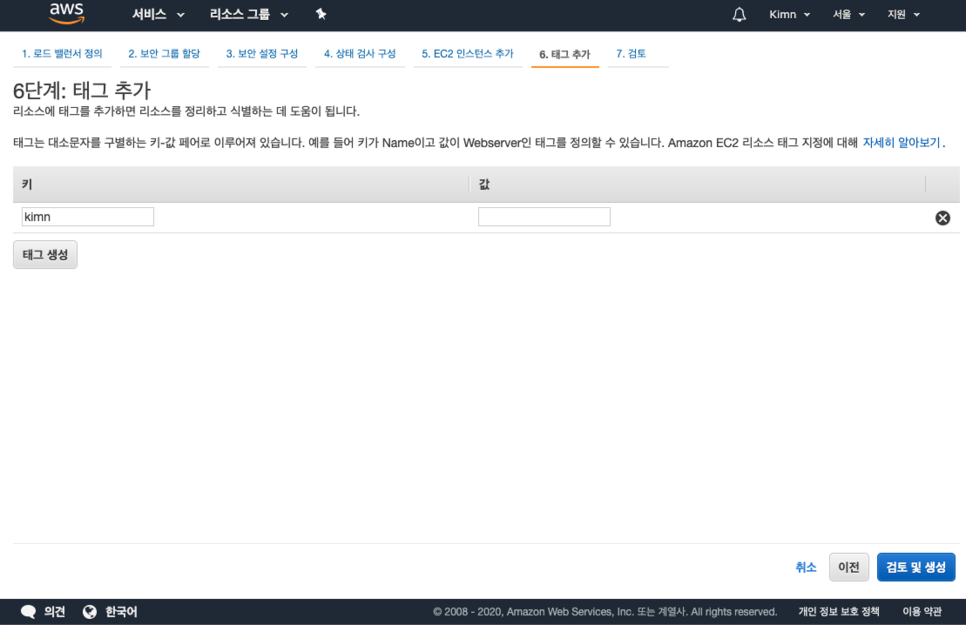8. 태그 추가 단계입니다. 저는 kimn 키를 추가하였습니다.