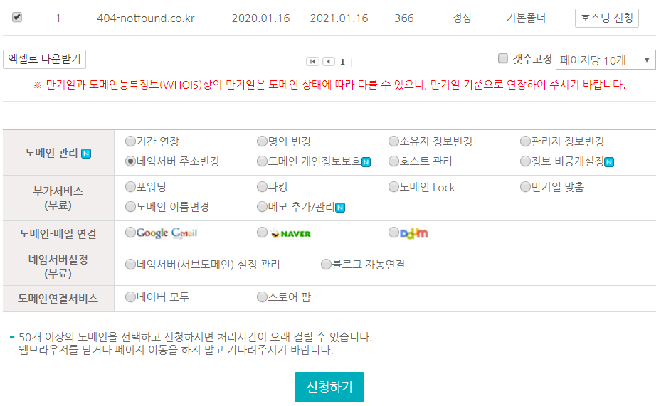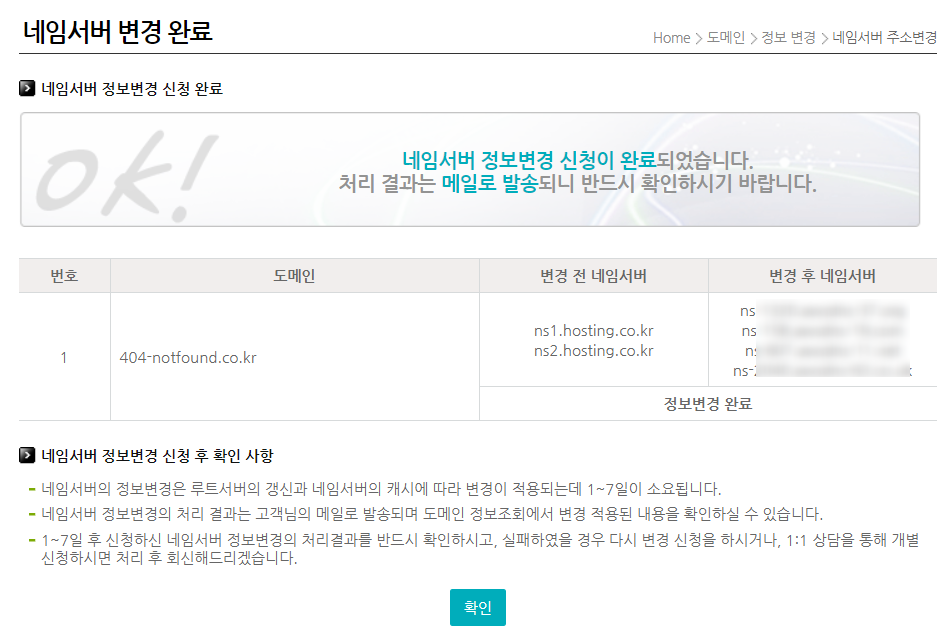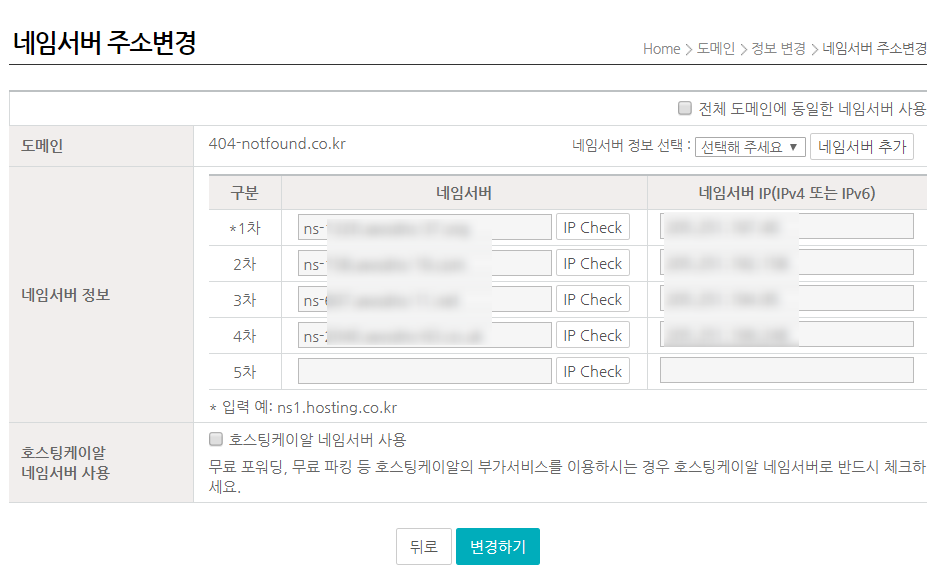 도메인 서비스 업체의 도메인 관리에서 네임서버 주소변경을 해봅시다.