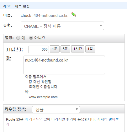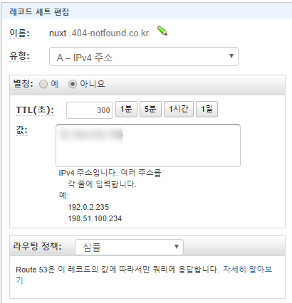 먼저 A 유형으로 생성하였습니다. 값에 EC2 IP 주소를 입력하시면 됩니다.